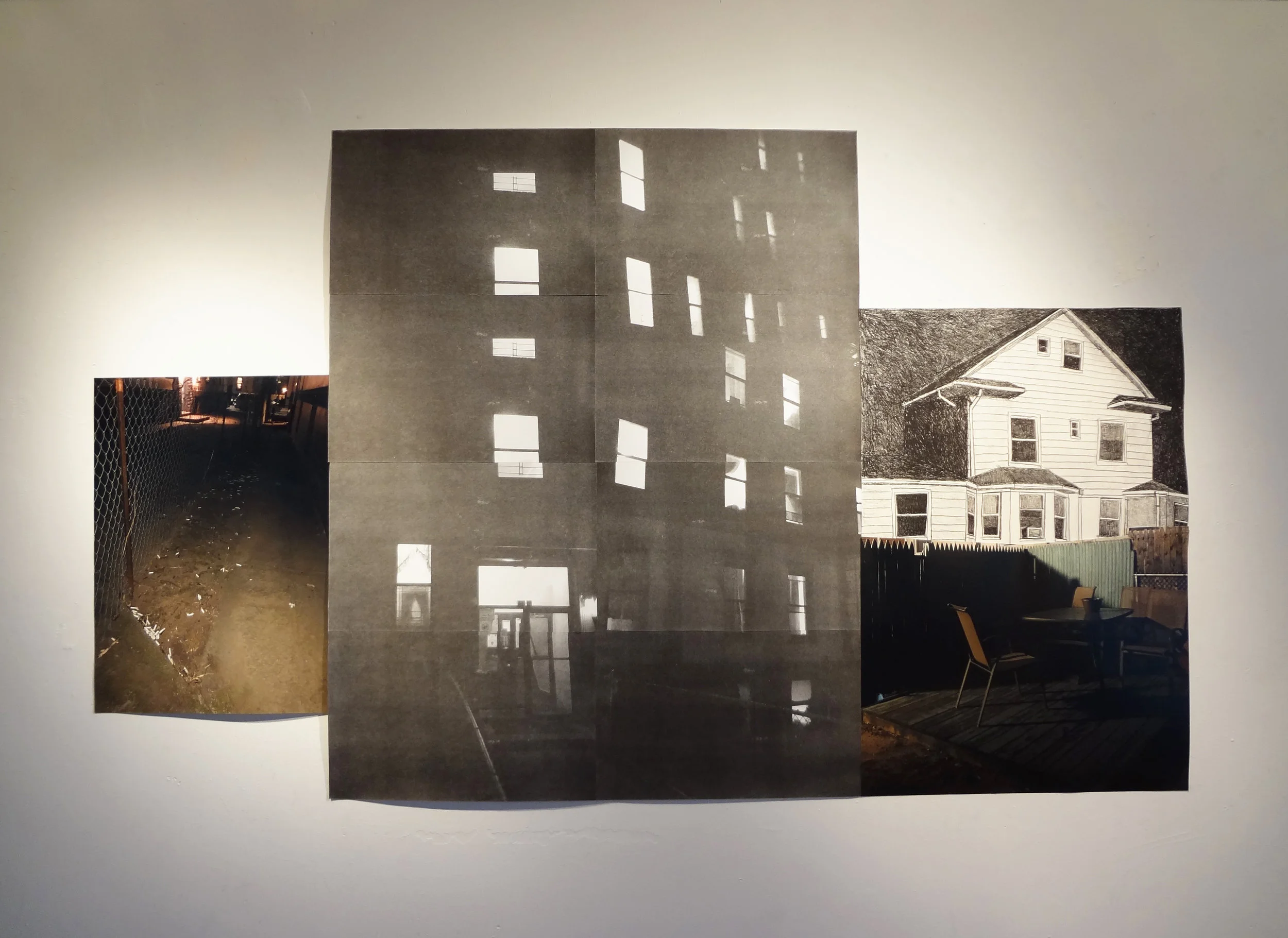 “Tent, Trellis, Spaceship,” 2019. Fabric, plastic, photography on paper and plastic, found rods, racks and wood, tape, string; 75x80x54 inches (or Naomi-sized). Installation views from Klapper Gallery, Queens College (NY).